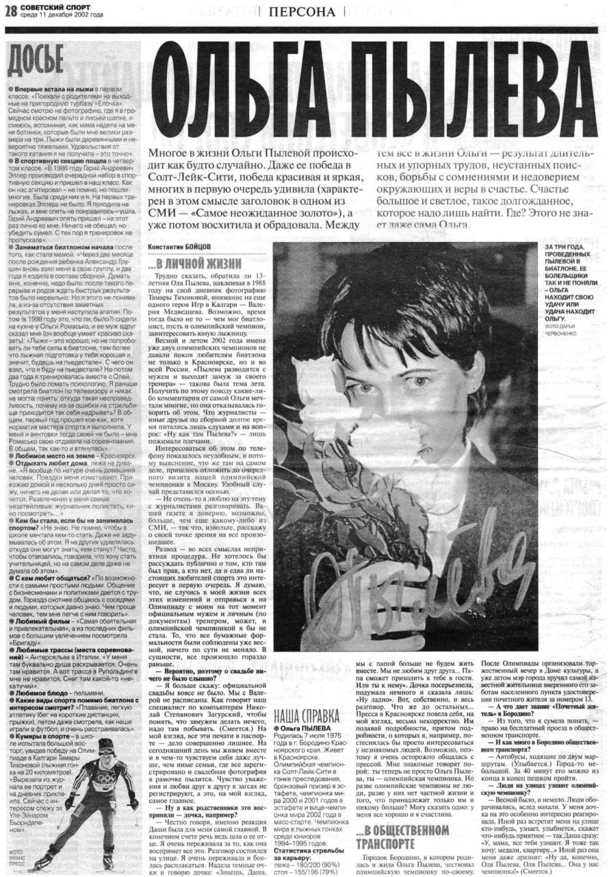 Весной и летом 2002 года имена уже двух олимпийских чемпионов не давали покоя любителям биатлона не только в Красноярске, но и во всей России. «Пылева разводится с мужем и выходит замуж за своего тренера» такова была тема лета. Получить по этому поводу какие-либо комментарии от самой Ольги мечтали многие, но она отказывалась говорить об этом. Что журналисты — иные друзья по сборной долгое время питались лишь слухами и на вопрос: «Ну как там Пылева?» — лишь пожимали плечами.